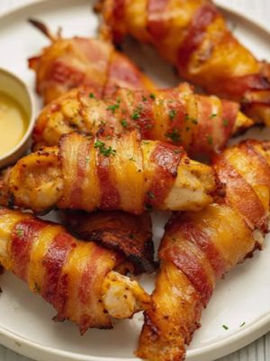 Juicy chicken fingers wrapped in crispy bacon, baked until golden and perfectly crisp while the chicken stays tender inside. Served with our signature creamy green sauce aioli and a smoky red guajillo-chipotle dipping sauce. Crunchy, bold, and irresistible.